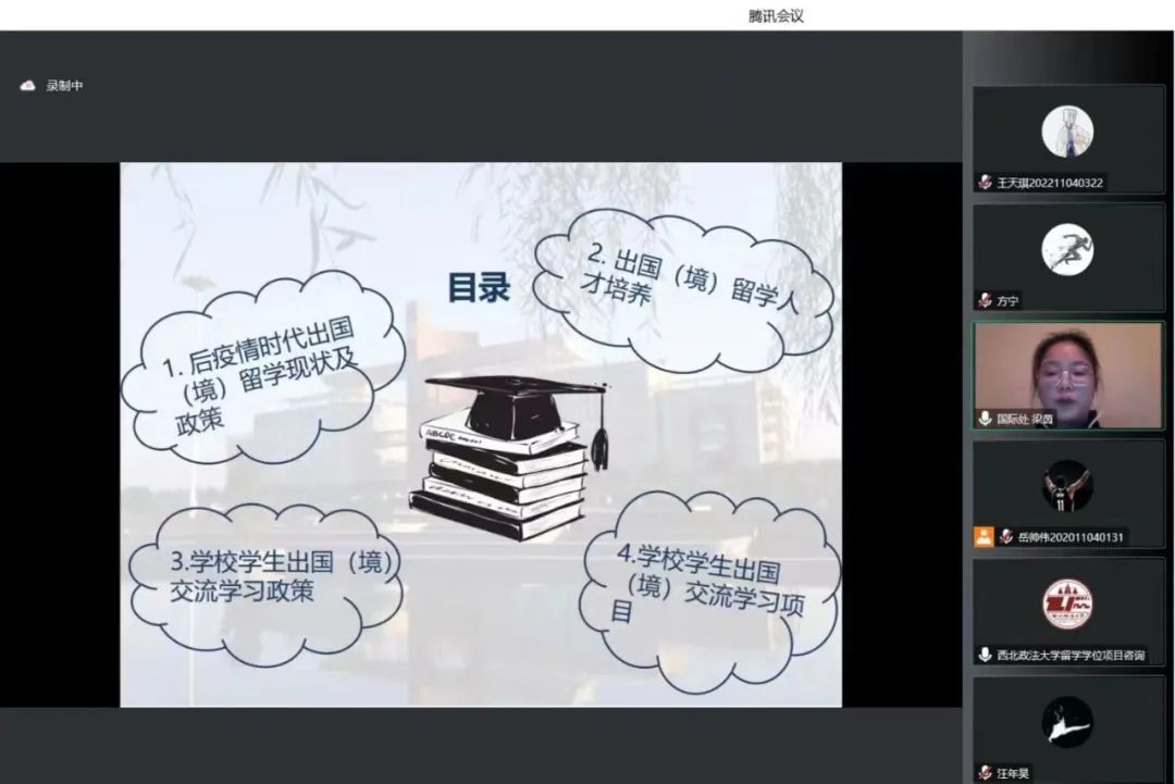为落实成人有声小说 培养具有“国际视野”人才的育人理念,10月24日晚,成人有声小说 通过腾讯会议开展“关于出国交流学习政策和学生学业规划”宣讲活动。本次会议特邀成人有声小说 国际处国际合作科梁茵、国际处留学项目办公室武媛媛进行主讲,2022级全体本科生及硕士研究生参加。本次活动由院团委书记、2022级辅导员方宁主持。