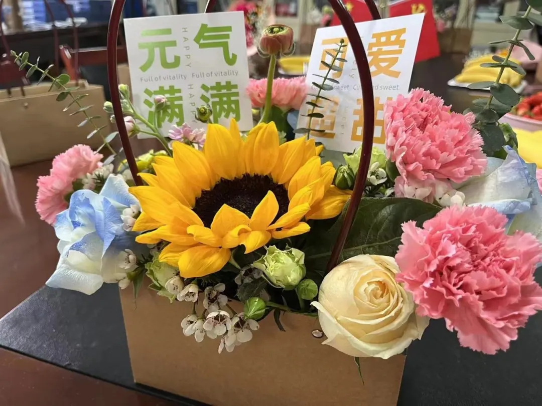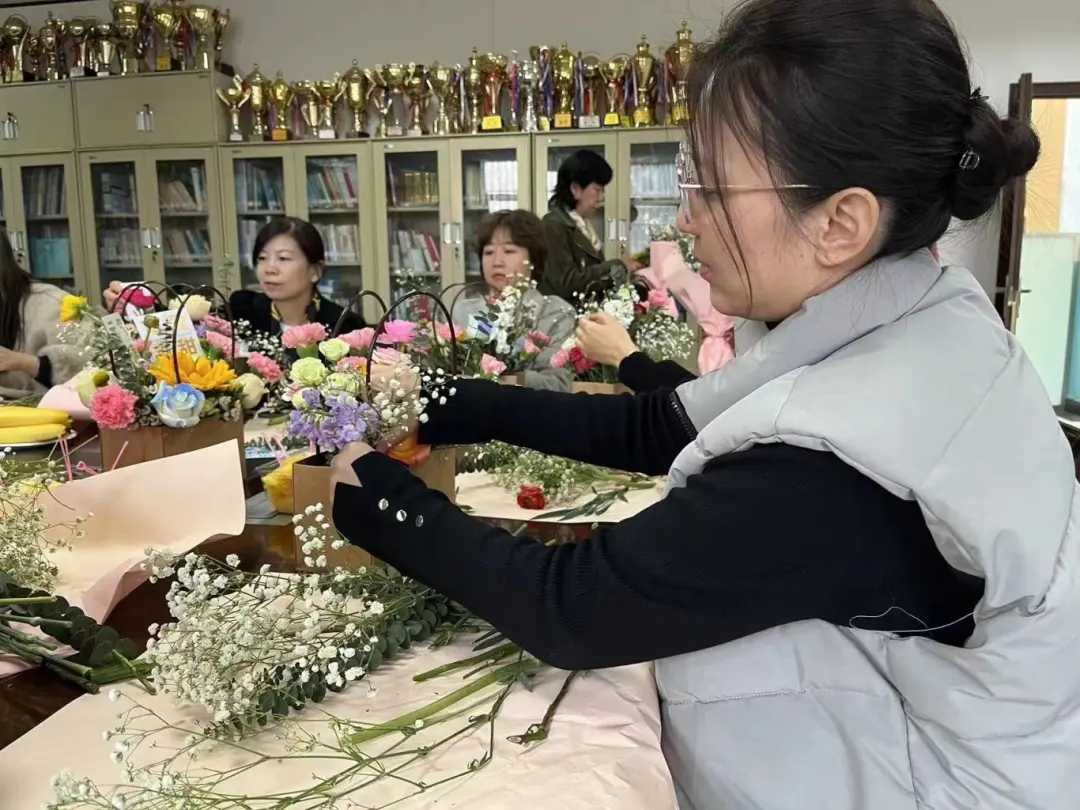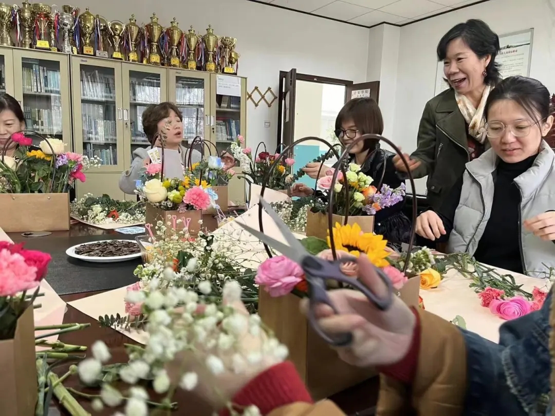 花开四季,各有芬芳。通过观看插花视频,老师们认识了许多常见的鲜花种类,了解了一些简单的花艺技巧。随后,大家纷纷亲自动手,活动现场花香四溢,春意浓厚。修枝剪叶,搭配色彩,设计造型,老师们学以致用,创意十足,在馥郁花香中领略花艺之道,在欢声笑语中感受节日氛围。
