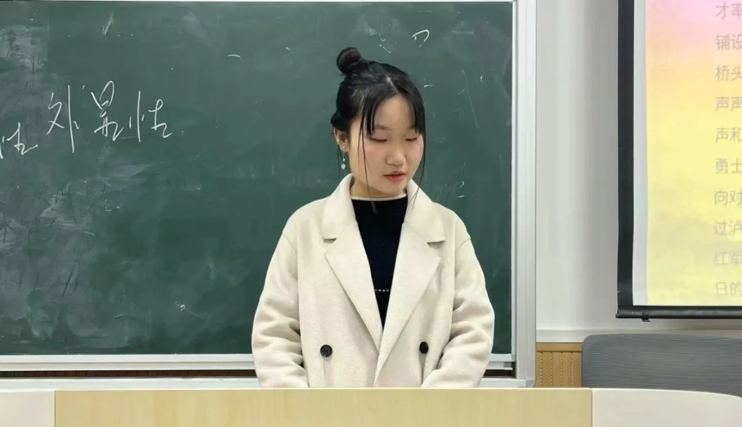 吴嘉怡选取中国工农红军长征中的重要战役——飞夺泸定桥进行宣讲,她从泸定桥的地理位置、战争背景、战略意义等方面讲述了此次战役对我军北上乃至整个战线的重要价值。