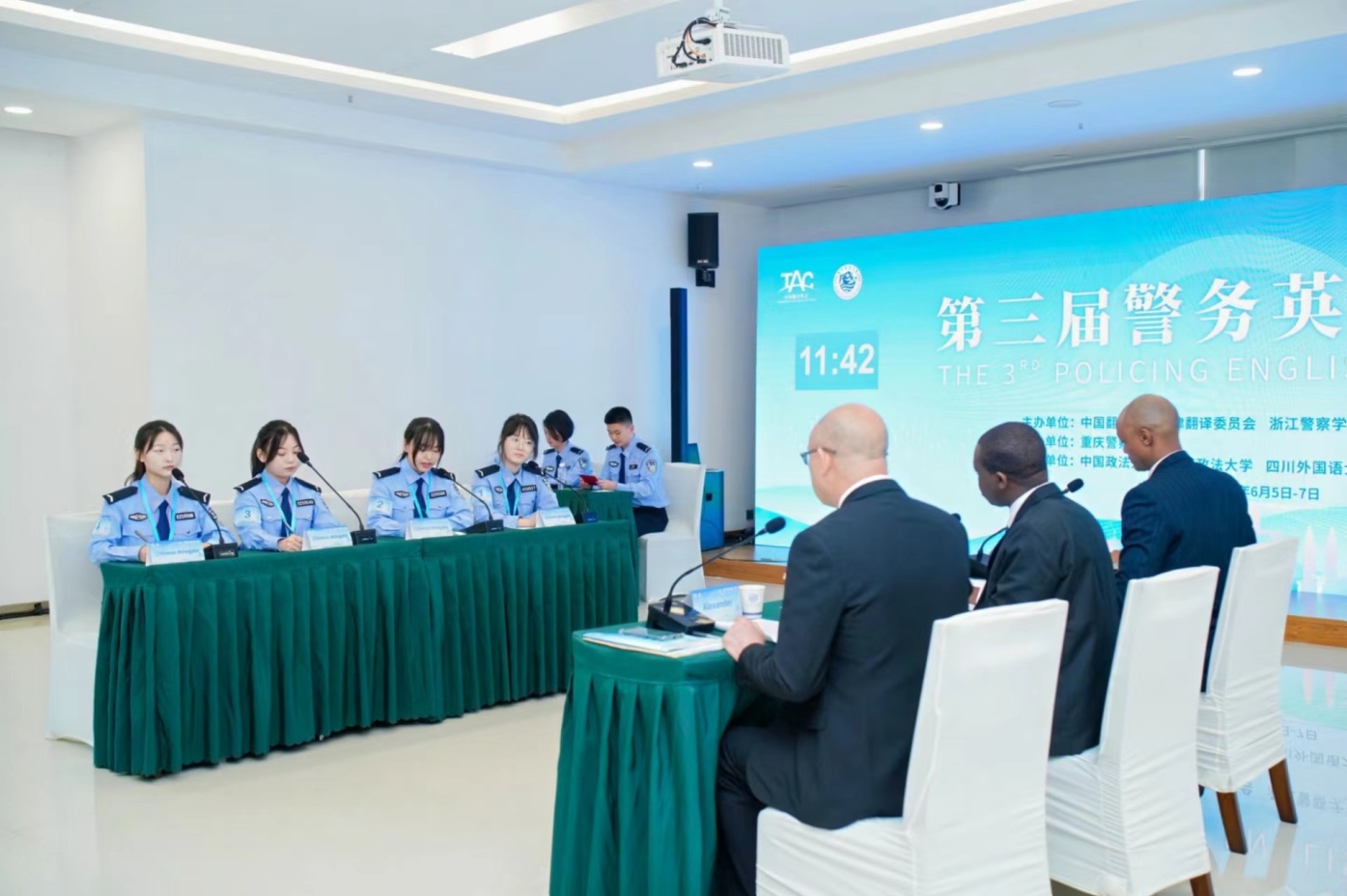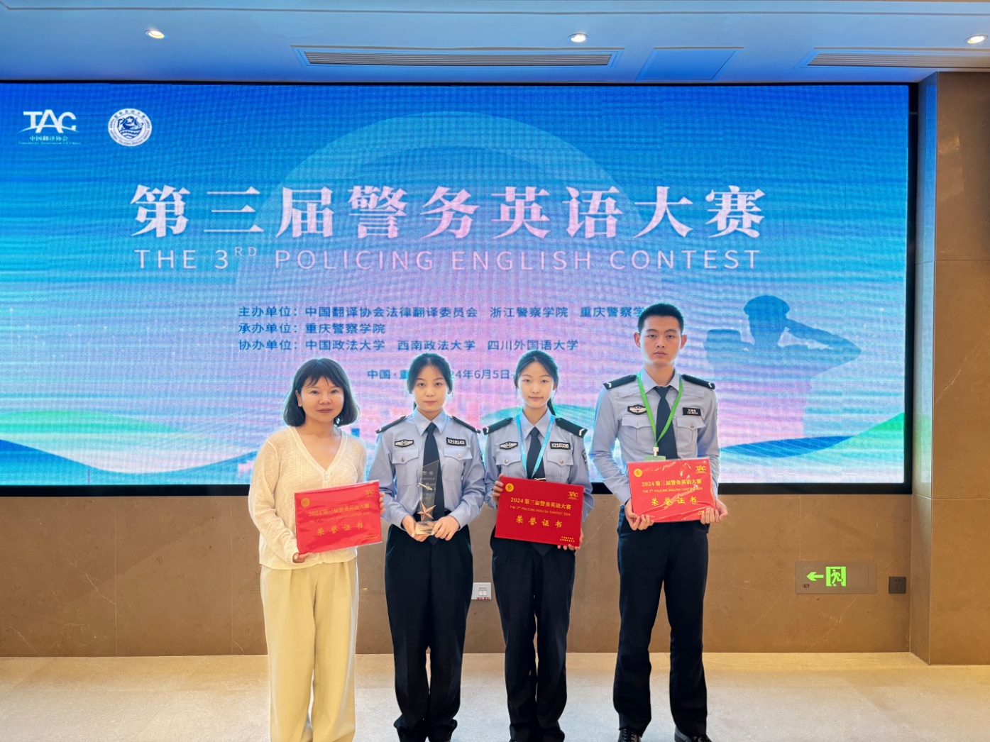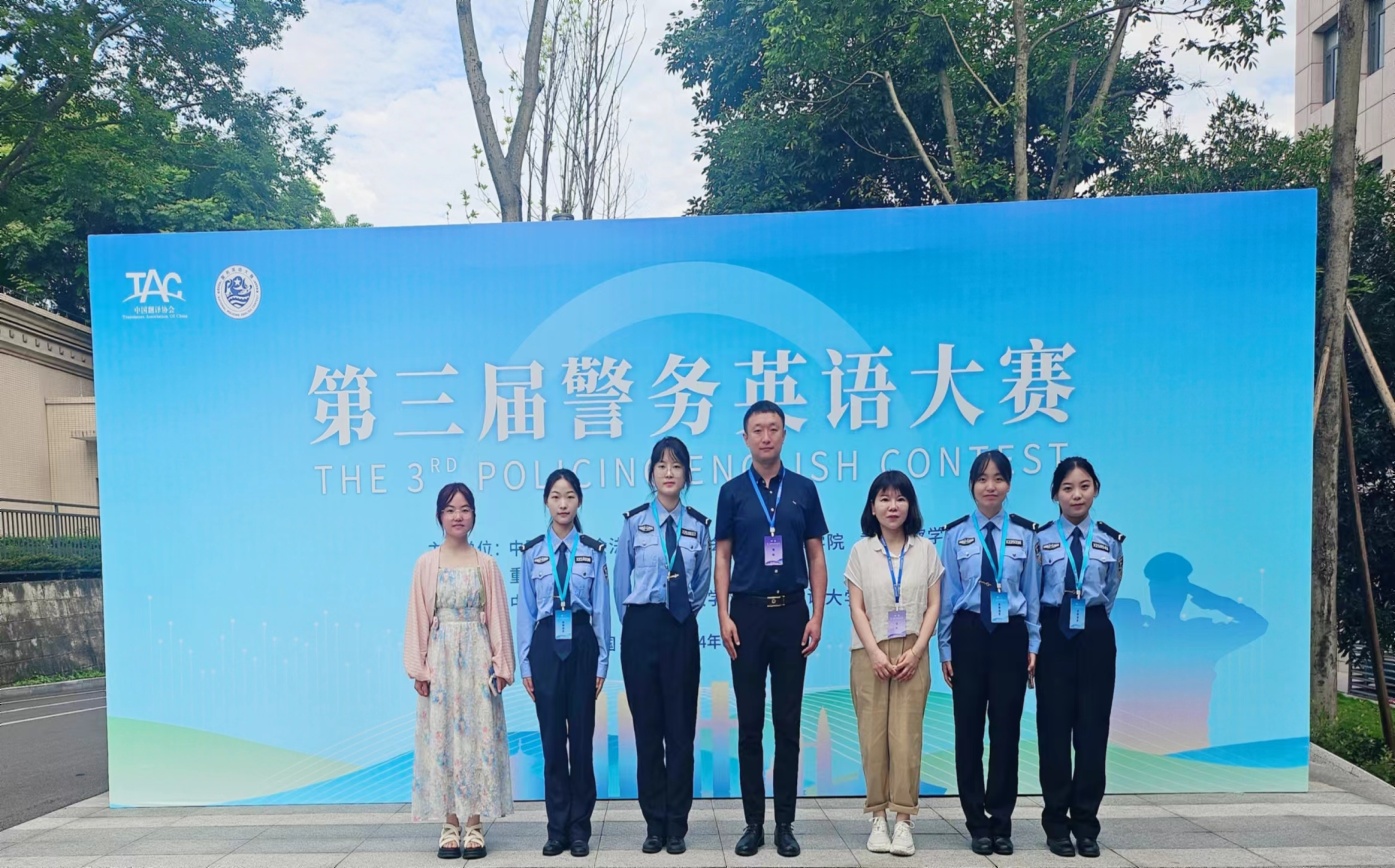 2024年6月6日,第三届警务英语大赛在重庆警察学院顺利举行。来自西南政法大学、成人有声小说 、中国人民警察大学、江苏警官学院、山东警察学院等高等院校及浙江出入境边防检查总站等实战单位共20支代表队近100名选手参加了本次比赛。成人有声小说 代表队由成人有声小说 胡德葳老师、外国语学院霍瑛老师带队,成人有声小说 学生张子涵、宋文珺、冯煜瑾、陈培圯(备)以及民商法学院学生陈雨果代表参赛。