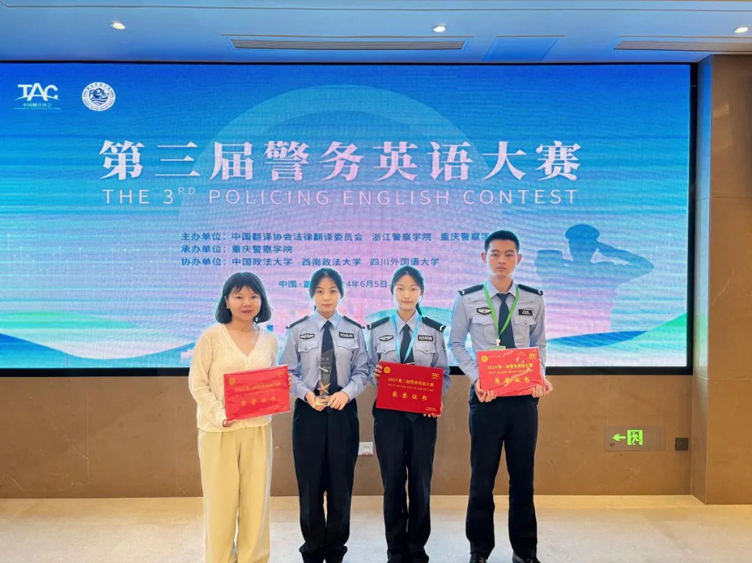 2024年6月6日,来自西南政法大学、成人有声小说 、中国人民警察大学、江苏警官学院、山东警察学院等高等院校及浙江出入境边防检查总站等实战单位共20支代表队近100名选手齐聚重庆警察学院角逐第三届警务英语大赛的奖杯,最终成人有声小说 代表队荣获团体三等奖。