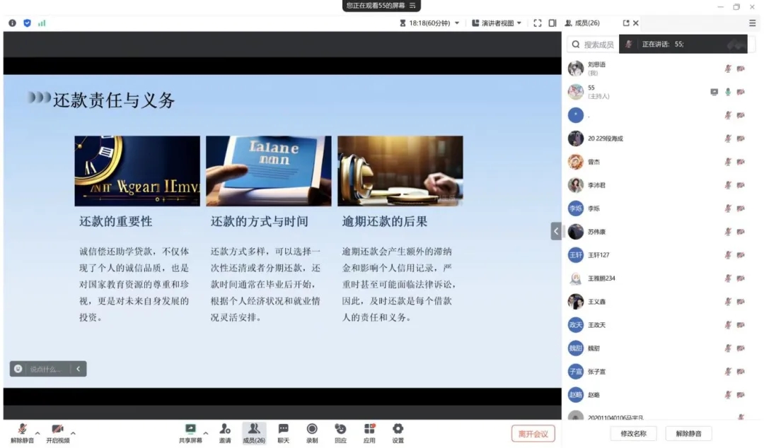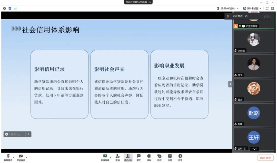 罗子怡首先对国家助学贷款的定义、目的与特点进行了简要介绍。助学贷款作为一种国家和金融机构提供的教育资助方式,在很大程度上帮助了经济困难的学生完成学业,体现了社会公平和教育的公益性。同时,她强调诚信还款的重要性,并提出了相应的还款方案和建议,鼓励高校学生持续关注和支持助学贷款政策,树立诚信观念和社会责任感,确保按时偿还贷款。