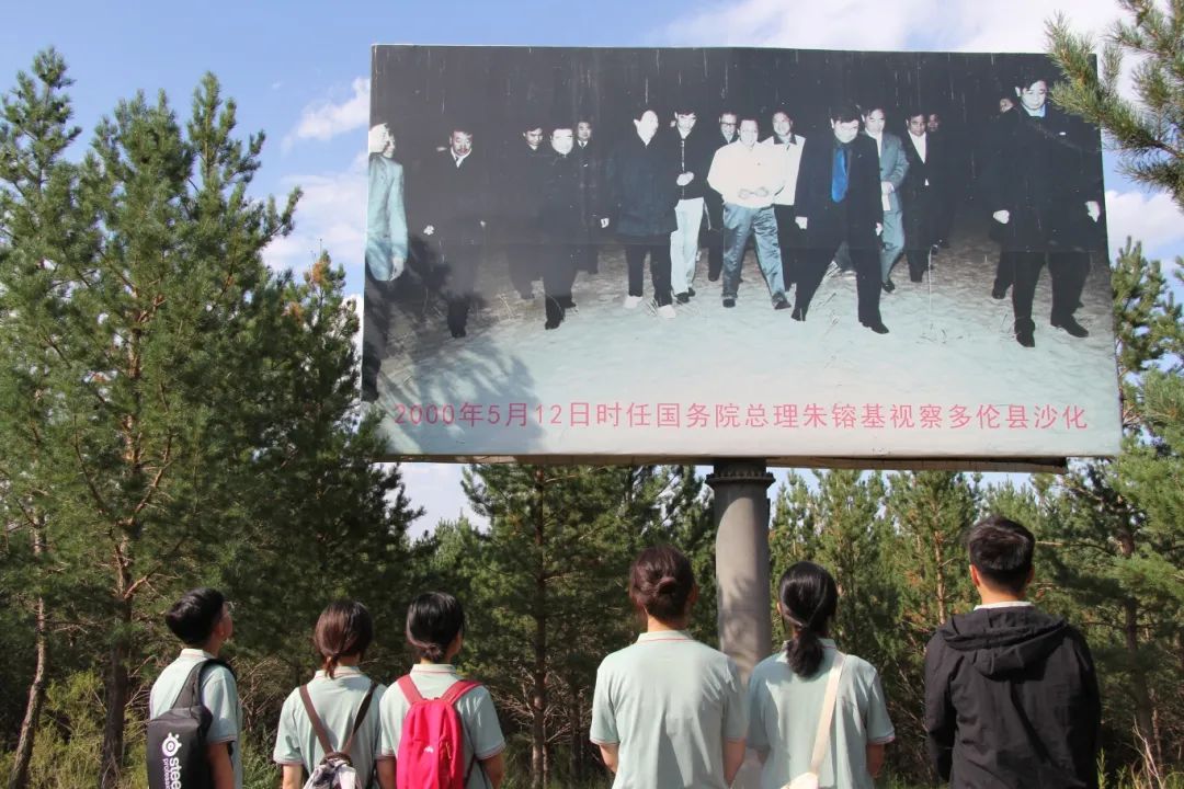 青寻“治沙造氧”生态保护实践小组的队员们沿着总理曾经视察时走过的路,认真聆听讲解员的介绍,仔细阅读着一段段的文献与资料。通过讲解员的热情介绍和文字、图片资料的详细展示,队员们了解到了在多伦县治沙二十余年中人民的付出之多,多伦县治沙取得的成效之大,多伦县人民的生活正在因为治沙而日益富足。成员们注意到,在挂着总理视察照片的巨大展板下方,有意保留了一块原始地貌,以示后人要铭记生态建设的艰苦历程。最后,队员们在纪念朱镕基总理视察的石碑前宣誓,势必为祖国的治沙事业贡献力量。