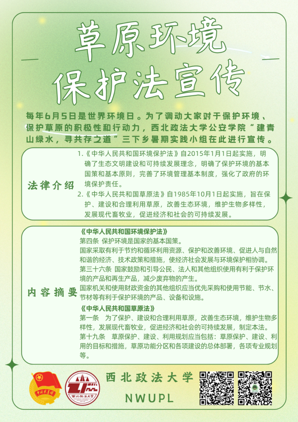 为深入学习贯彻习近平生态文明思想,践行“绿水青山就是金山银山”的理念,成人有声小说 青寻“治沙造氧”生态保护实践小组联合多伦县气象局开展“建青山绿水 寻共存之道”主题普法宣讲活动,宣讲内容为《中华人民共和国环境保护法》和《中华人民共和国草原法》。