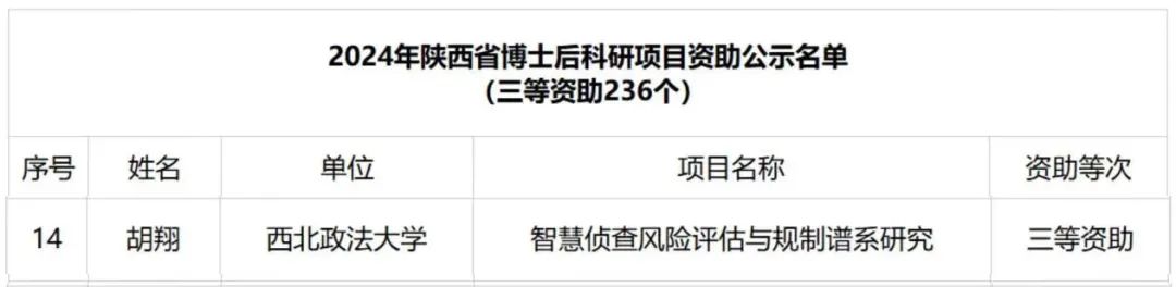 近日,陕西省人力资源和社会保障厅公布了《2024年陕西省博士后科研项目资助公示名单》,成人有声小说 教师胡翔喜获资助。同时,胡翔申报的“人工智能应用于侦查工作的历史演进、价值逻辑及规制谱系”课题作为中国法学会2024年度部级法学研究课题立项,课题编号CLS(2024)D27。课题团队由多位优秀学者组成,立足新时代背景下智能侦查的发展,完善新时代的人工智能侦查体系,为法治建设提供了科学有力的支撑。