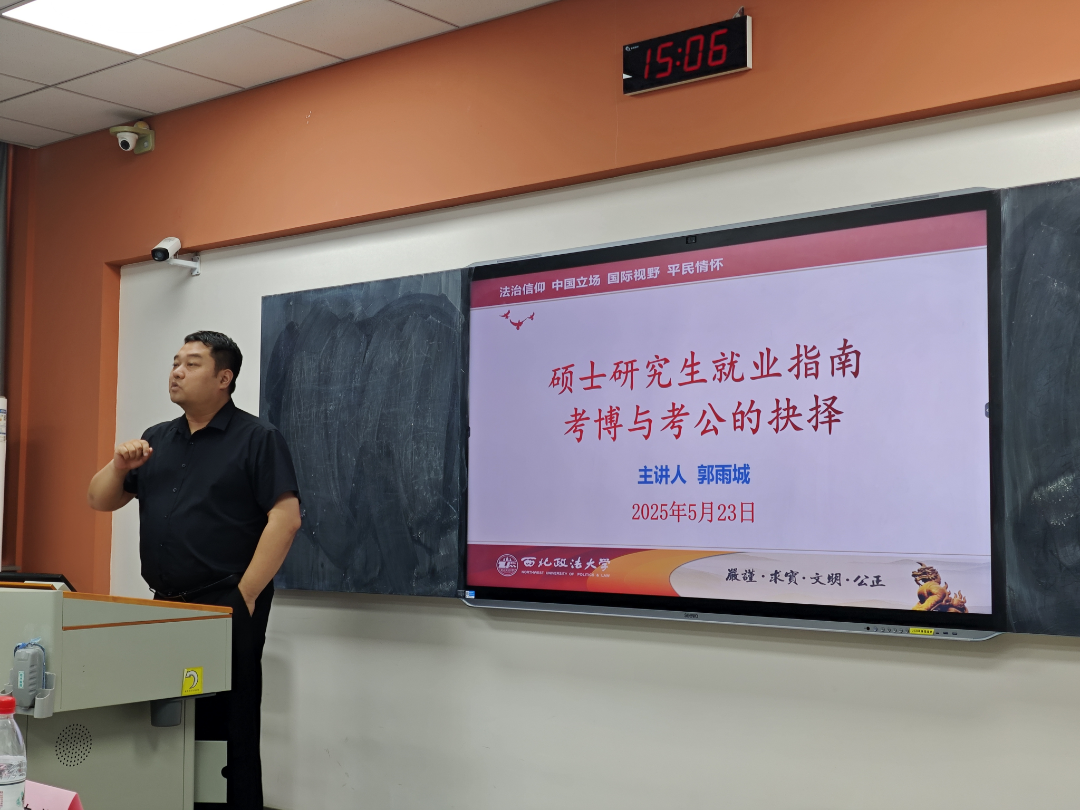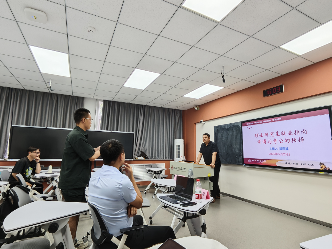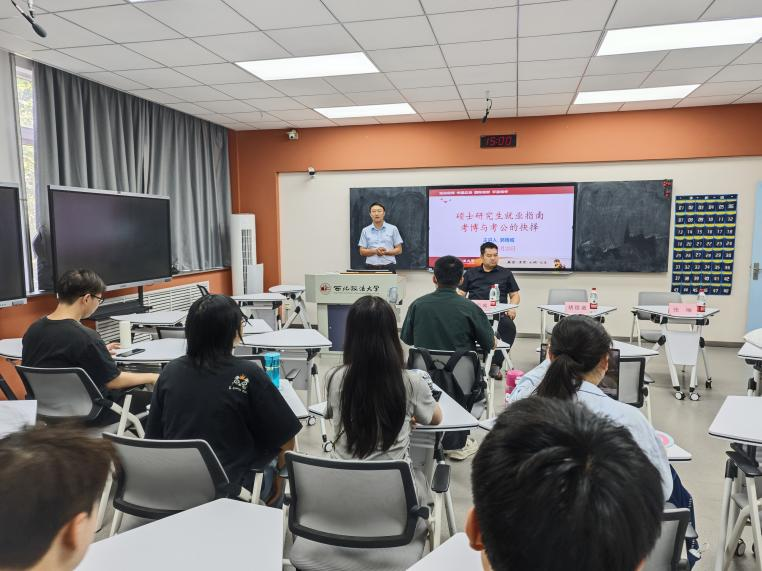 在研究生阶段,同学们常常面临一个重要的抉择:是继续深造考博,还是进入公务员队伍考公?这是一个关乎未来职业发展和个人成长方向的关键决策。为解答研究生这一困惑,5月23日,成人有声小说 (公共安全法学院)于雁塔校区三号教学楼3504教室举办“研途时光”第三期:硕士研究生就业指南考博与考公的抉择。本次活动邀请成人有声小说 教师郭雨城主讲,由院长助理胡德葳副教授主持。