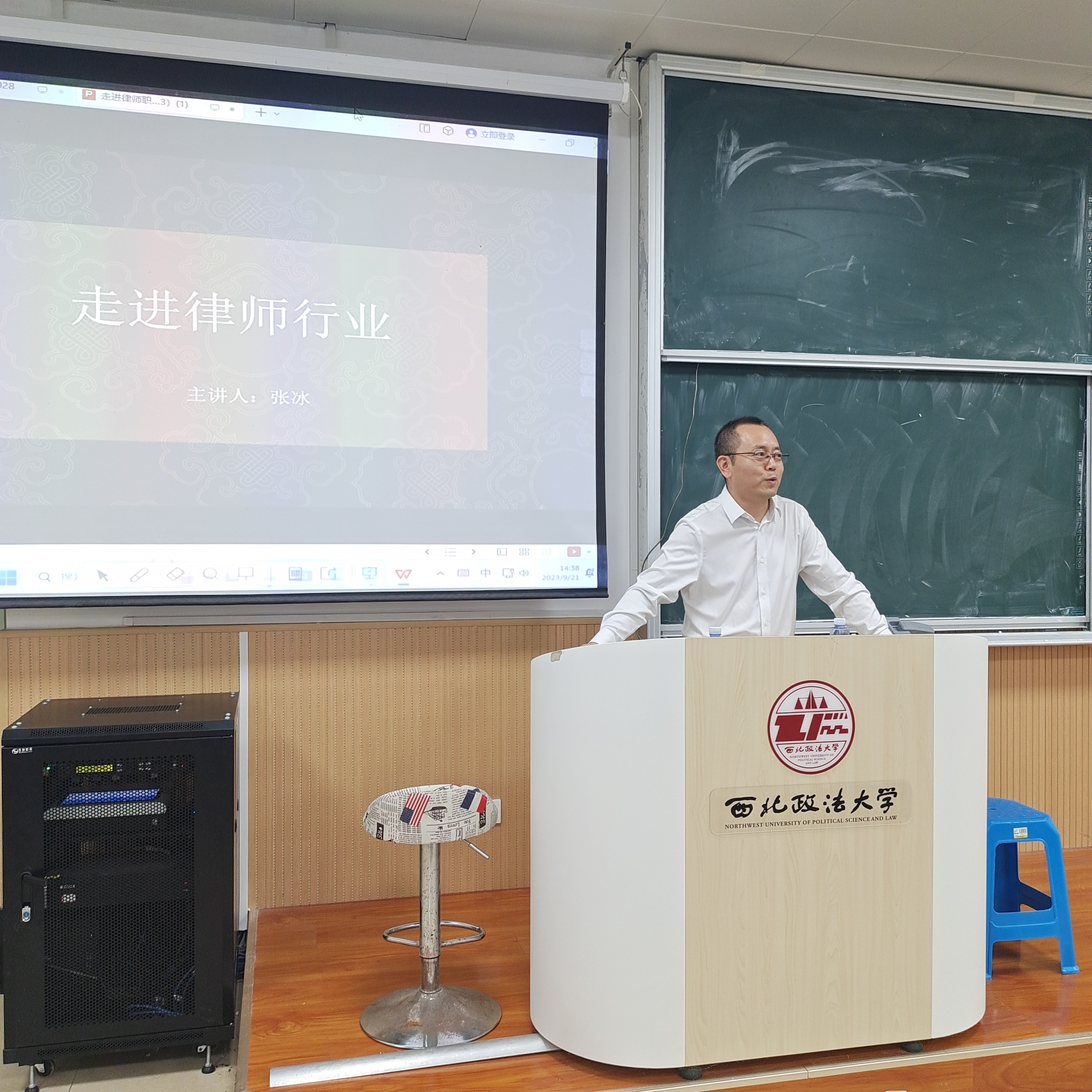 张冰主要围绕律师制度历史起源与发展;律师的分类、从业条件、业务范围;律师事务所设立条件和分类;中华全国律师协会和陕西律师协会;如何走进律师职业五方面的内容展开。他强调法律职业是法律知识、人生智慧、综合能力和法律信仰的有机融合;勉励同学们做到法律知识与司法实践知识并重,提升法律素养、打牢法律功底,努力成长为一名合格的法律工作者。