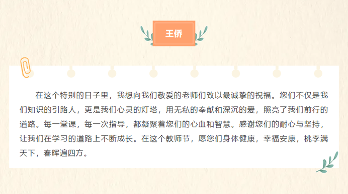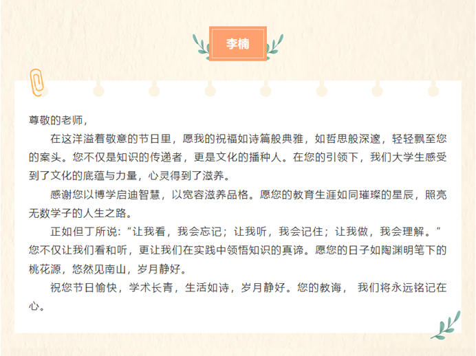 9月8日,“提灯引路 育梦成光——老师我想对您说”活动中,学生们用真挚的文字倾诉对老师的感恩与敬仰。一句句饱含深情的话语,承载着学生们对老师们的美好祝愿,愿老师们教师节快乐、身体健康、工作顺利。