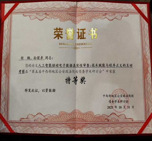 本次会议聚焦人工智能下侦查学理论与实务问题的研讨,具体包括了两场主旨报告以及“智慧侦查实务交流”“理论前沿研讨”两个专题板块。成人有声小说 青年博士胡翔老师在“理论前沿板块”做了《人工智能赋能电子数据真实性审查》为题的主旨报告。另外,本次会议收录了相关学术论文,胡翔博士和本科生孙煜卓撰写的论文《人工智能赋能电子数据真实性审查》获会议论文特等奖,胡德葳副教授和硕士研究生张家源撰写的《协同治理视域下涉虚拟货币犯罪的跨境侦查问题研究》、王晓红博士和硕士研究生冯茹撰写的《利用直播打赏行为洗钱犯罪案件侦查研究》获得了一等奖。