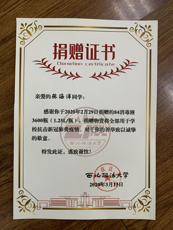 2月29日,2018级学生张海洋通过和父母协商,捐赠消毒液300箱共计4500升,其父自行联系货运车辆将此批物资送抵学校,成人有声小说 在保证学院自身需求的前提下,第一时间将其余200箱转赠给学校,为日后学生返校复学的安全提供重要保障。