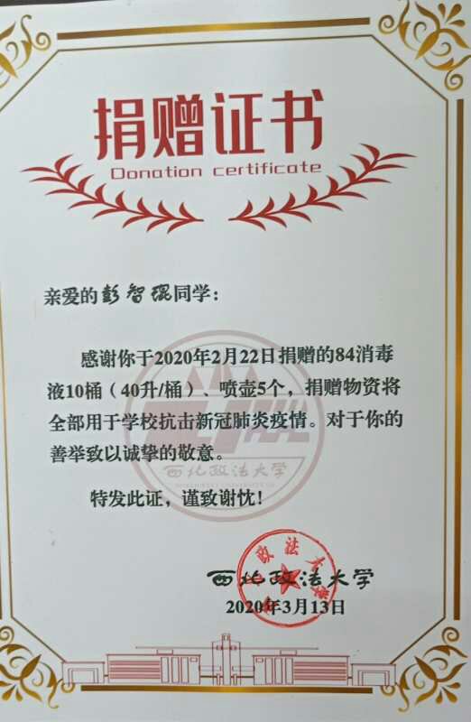 2月22日,2017级学生彭智琨与其父亲自费网购大桶84消毒液10桶共计400升和喷壶数个,自驾送到学校进行捐献。