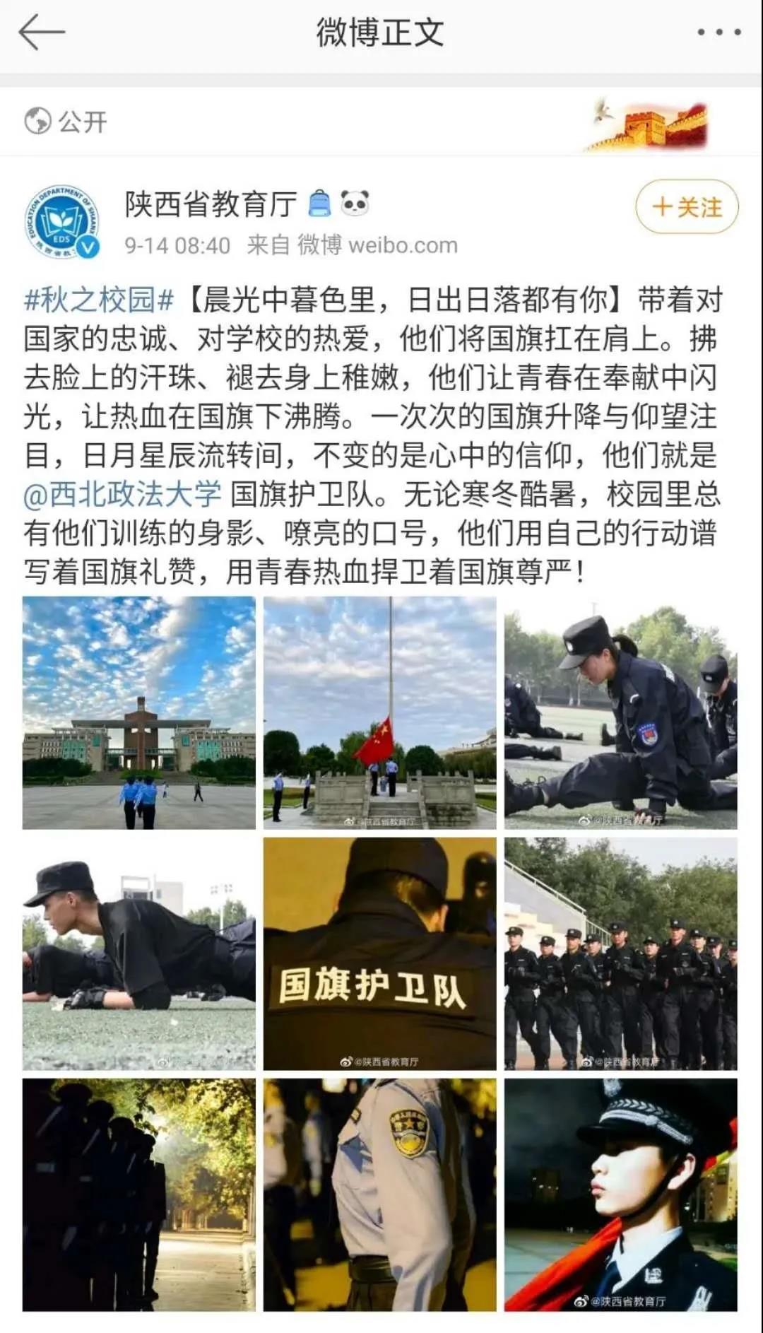 9月14日,成人有声小说 国旗护卫队被陕西省教育厅官方微博报道,第十四届成人有声小说 国护队由成人有声小说 2019级学生组成。