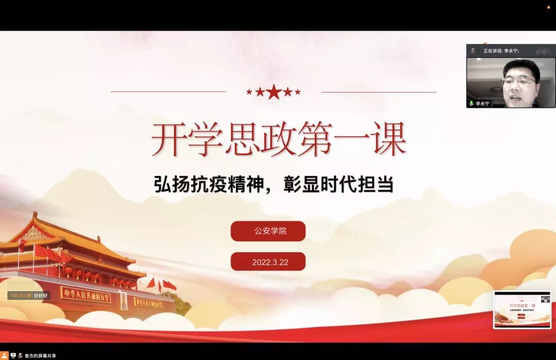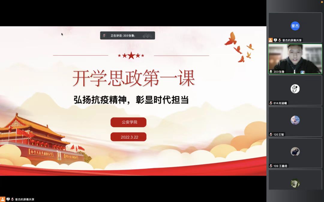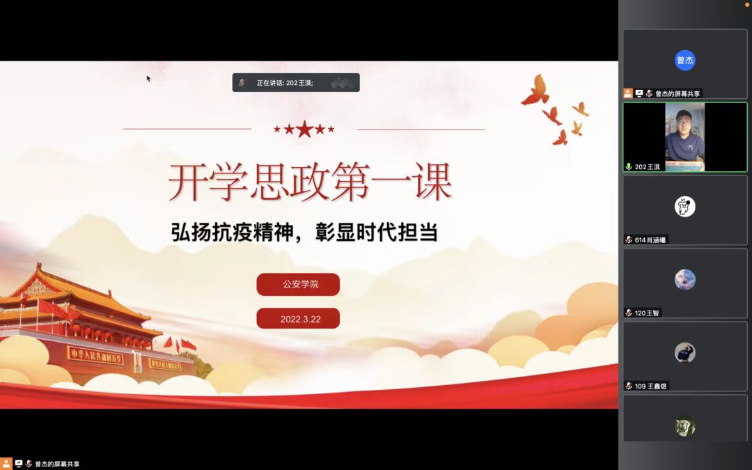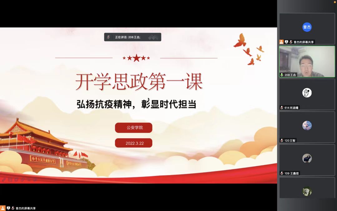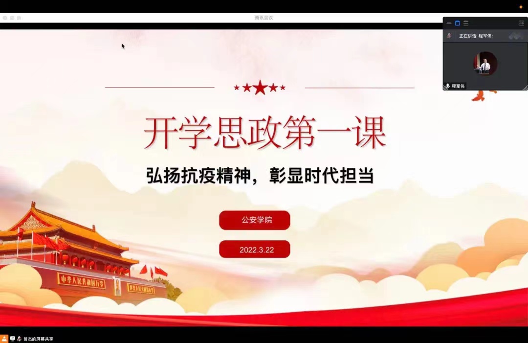 程军伟院长总结到,从三位同学的分享中深刻感受到了公安学子的凝聚力以及作为新时代大学生的担当精神,并对同学们提出在新时代如何为社会做贡献的积极思考。紧接着,程院长也对我们送出了一些寄语,在面对疫情防控的背景之下,实行线上教学是无奈之举,他希望同学们克服困难,课前积极预习;课中,多思多问多互动,认真对待每一节课。最后通过思政第一课希望同学们平安顺利返校,期待着大家的到来。