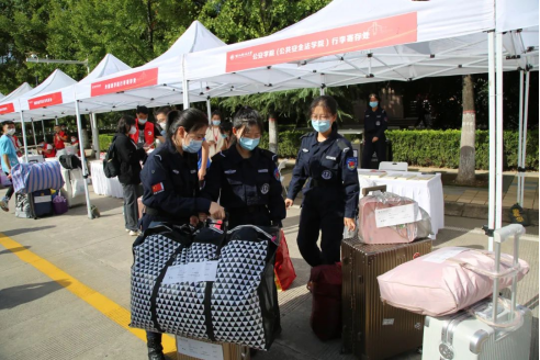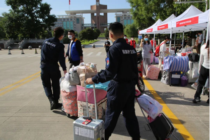 新生们拎着行李挥手向家人告别